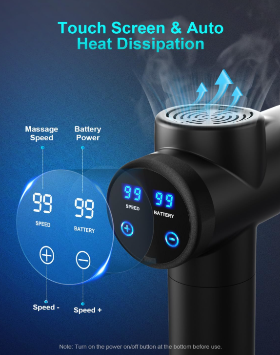 - User-Friendly LED Touch Screen Display: The deep muscle massage gun is equipped with easily monitor and adjust your massage with the intuitive LED touch screen. Instantly see the selected speed gear and real-time battery percentage. Simply press "+" or "-" for effortless speed changes – operation couldn't be easier